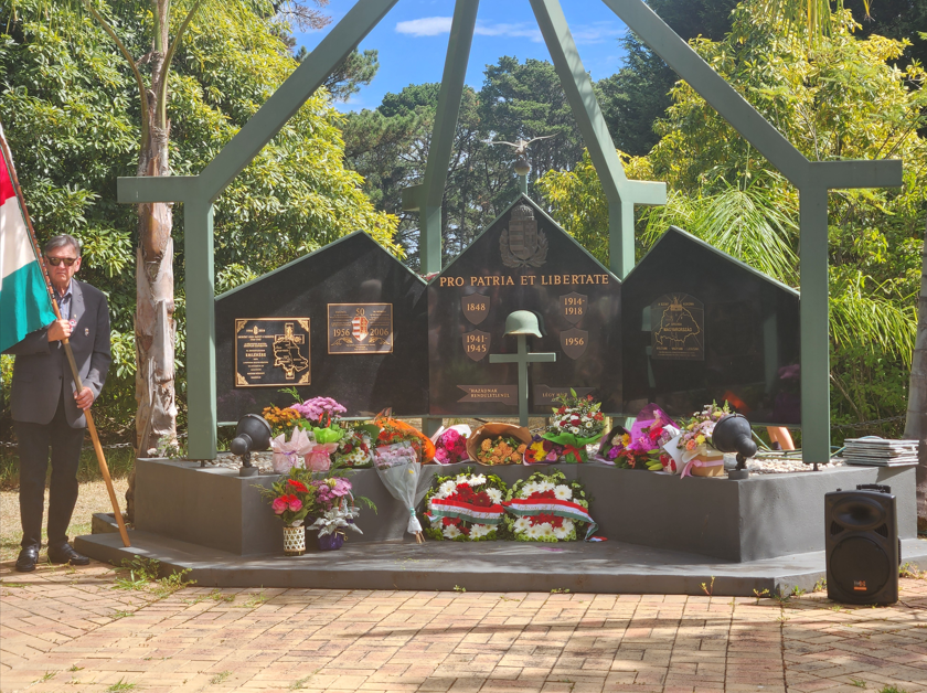 Vitéz Kövesdy-Ámon Lilla, Staff Captain Australia and Vitéz Nemes galánthai Fekete Mária, Seat Captain Victoria and Vitéz Fazakas Caroline, Vitézi Hadnagy Victoria, lay flowers (Koszoruzás) at the Heroes Memorial at the Hungarian Centre, Melbourne Australia.